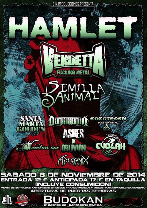 La nueva edición del Alburock de noviembre cambia de fecha, de localidad y de nombre, pasará a celebrarse el 8 de noviembre en la Sala Budokan de Cartagena, Murcia y deja por el camino la denominación de Alburock, eso sÃ, siguen confirmando a Hamlet como cabeza de cartel más Vendetta Fucking Metal, Semilla Animal, Robot Porn, Deathsurrection, Santa Marta Golden, Evolah, Advermix, Newton Cae y Ashes Of Oblivion. 12 € anticipada y 17 € en taquilla, con consumicion incluÃda. Cartel: