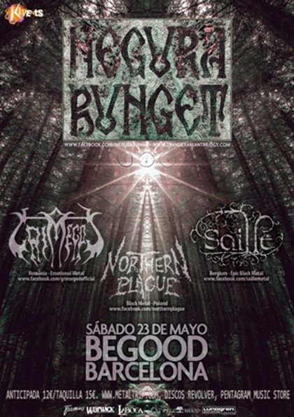 Negura Bunget vuelven a la penÃnsula pero sólo realizarán una única fecha el 23 de mayo en Barcelona, Sala BeGood, allà presentarán su nuevo álbum "Tau", una edición del sello alemán Prophecy. En esta gira que por ahora tiene más de 70 fechas, les acompañará Northern Plague de Polonia, Saille de Bélgica y Grimegod de RumanÃa. Precio de venta anticipada 12 € más gastos, 15 € en taquilla. Anticipada en Revolver, Pentagram Music Store, www.metaltrip.com: