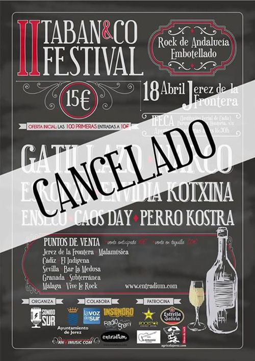 Comunicado oficial de la asociación juvenil Sonido Sur: "Hoy es un día muy triste para nosotros. Lamentablemente, desde la organización del que iba a ser el II Taban&Co Festival nos vemos en la terrible situación de tener que cancelar el festival.