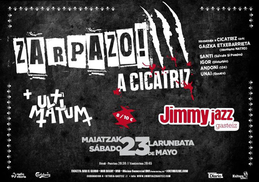 Zarpazo! a Cicatriz, la banda que se encarga de homenajear a los alaveses Cicatriz y que está formada por Gaizka Etxebarrieta, Santi, Igor, Porrax y Andoni actuará el próximo sábado 23 de mayo en la Sala Jimmy Jazz de Vitoria-Gasteiz. El quinteto estará acompañado por los navarros Últimatum. El concierto dará comienzo a partir de las 20:45h. y las entradas 8€ Ant./10€.Taq. ya están a la venta en Hor Dago!, VSD, Oficina Comercia del Diario de Noticias de Álava y Kulturalive.com. Los ganadores de las entradas individuales son: