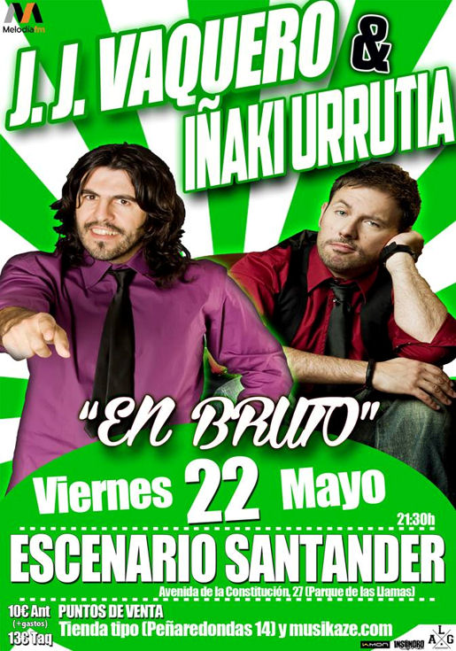 Los monologistas J.J. Vaquero e Iñaki Urrutia actuarán el 22 de mayo en el Escenario Santander presentando su espectáculo "En Bruto". 21:30 h. 10€ anticipada en Tienda Tipo y musikaze.com, y 13€ en taquilla. Los ganadores de las entradas individuales son: