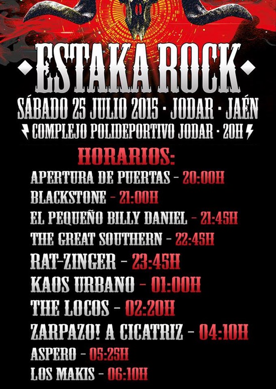 Ya disponibles los horarios para el Estaka Rock de este sábado en Jódar (Jaén) con The Locos, Kaos Urbano, Rat-Zinger, Zarpazo! a Cicatriz y un largo etcétera