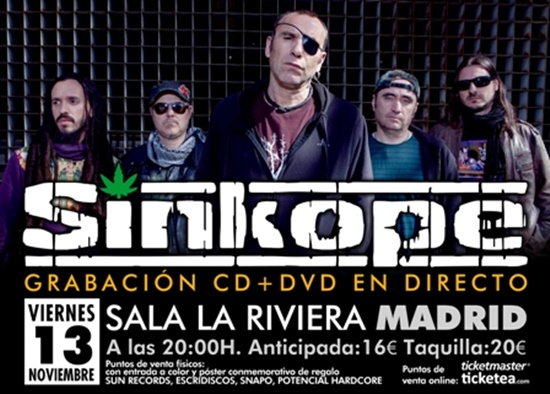 Ha pasado mucho tiempo, pero por fin llega el momento. Tras 25 años de trayectoria; giras, giras y más giras; diez trabajos impecables y haber conseguido ser un nombre imprescindible en los festivales más importantes del país; Sínkope lanzarán un disco y DVD en directo. Marquen desde ya el día y el lugar: 13 de noviembre en la sala La Riviera. Un trabajo que editará Rock Estatal Records durante 2016. Las entradas anticipadas a la venta a partir del 3 de septiembre en: Red Ticketmaster, Ticketea, Sun Records, Escridiscos, Snapo y Potencial Hardcore (la venta física incluye entrada a color y poster conmemorativo de regalo el día del concierto)