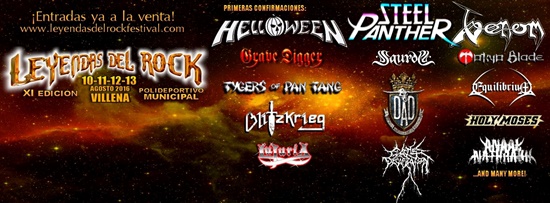 Hoy nos despertamos con nuevas confirmaciones para el Leyendas del Rock 2016, a los ya conocidos Grave Digger, Steel Panther y Holy Moses, se unen Helloween, Tygers of Pan Tang, D-A-D, Blitzkrieg, Saurom, Lujuria, Tokyo Blade, Cattle Decapitation, Equilibrium, Venom, Anaal Nathrakh.. Entradas a la venta a 60€ + gastos, por el momento solamente disponibles en la red de Ticketmaster; Fnac, Halcón Viajes, Carrefour, etc. Este precio especial se mantendrá por un tiempo indeterminado, puede que hasta final de año, como es costumbre, aunque dependerá bastante del ritmo de confirmaciones.