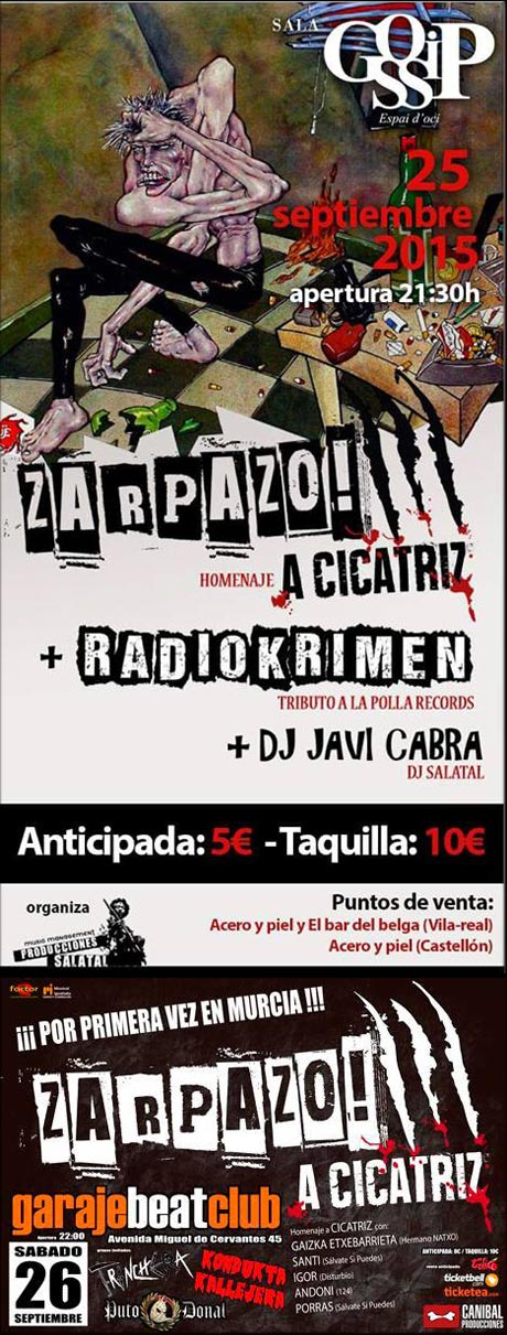 La banda alavesa Zarpazo! a Cicatriz nos cede dos entradas individuales para cada uno de sus conciertos en Vila-real, donde actuarán el próximo 25 de septiembre y Murcia, donde estarán un dÃa más tarde. Los ganadores de las entradas individuales son:
