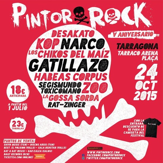 Dice la gente del PintorRock que el 24 de octubre temblará la tierra en Tarragona, ¿será verdad?, creo que con el cartel de este año si que lo conseguirán: Gatillazo, Segismundo Toxicómano, Narco, Habeas Corpus, Los Chikos Del MaÃz, La Gossa Sorda, Rat-Zinger, Zoo, Kop y Desakato. Video promo, venta de entradas, viajes organizados, alojamiento..:
