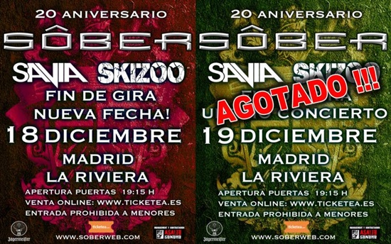 Sôber agota entradas para su concierto en Madrid (Sala La Riviera) del 19 de diciembre y sacan nueva fecha para el día antes, viernes 18 de diciembre. Comunicado de la banda: