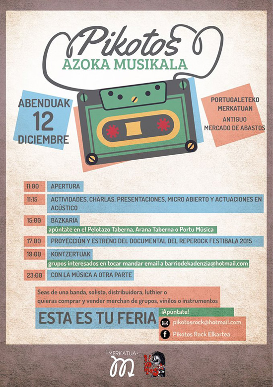 El sábado 12 de diciembre se celebró en Portugalete la primera edición de la "Pikotos Azoka Musikala". Una iniciativa popular que contó con bastantes actividades programadas durante toda la jornada en la antigua plaza de abastos. En su interior se concentraron varias bandas musicales y diversos colectivos, distribuidoras y puestos artesanos que exhibieron su material en cada uno de sus stands a un precio bastante reducido. [ video reportaje ]