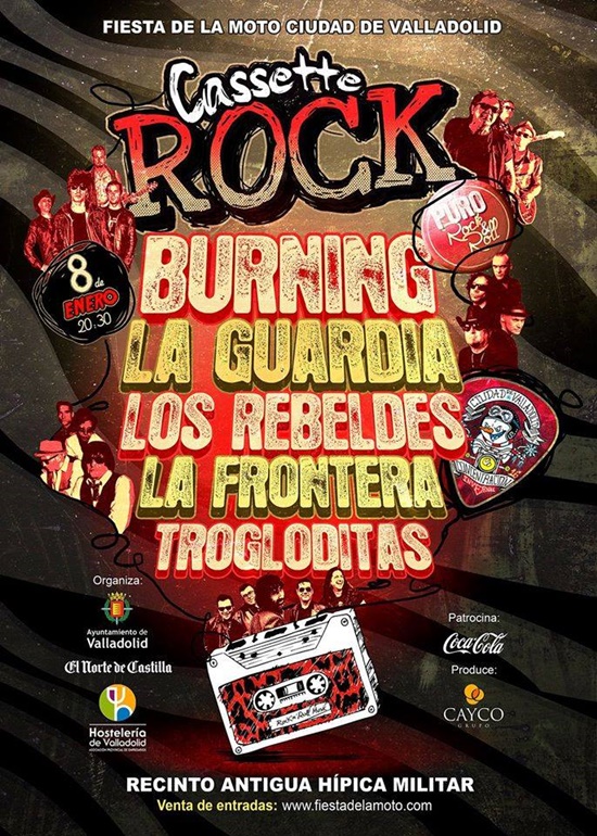 La ciudad de Valladolid acogerá la Fiesta de la Moto los dÃas 8, 9 y 10 de enero, tres dÃas con actividades, acampadas y por supuesto, música, todo en la Antigua HÃpica Militar. Musicalmente estará el Cassette Rock con Burning, Trogloditas, La Guardia, Rebeldes y La Frontera, para la noche del viernes 8 de enero, y Oscar de Rivera, Carlos Jean, Mägo de Oz, Los Extraños y Danza Invisible para el sábado 9. Más info en www.fiestadelamoto.com