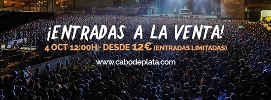 Desde el próximo 4 de octubre a las 12:00 se podrán comprar las entradas para el Festival Cabo de Plata 2017. Esta noticia es estupenda porque significa que habrá edición el año que viene, a pesar de las presiones, de las polémicas y de los intentos por parar lo imparable. ¡Nos alegramos mucho!. ¡¡Apuntad la fecha en la agenda!!. www.cabodeplata.com