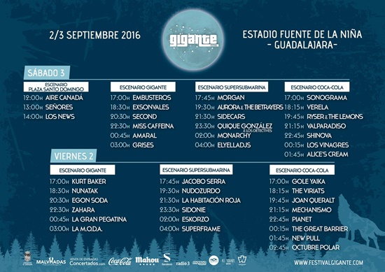 El Gigante Festival de Guadalajara confirma sus horarios, un evento para los días 2 y 3 de septiembre en el Estadio Fuente de la Niña, con numerosos grupos de diversos estilos, desde Amaral, Quique González & Los Detectives, hasta La Gran Pegatina, Eskorzo o La M.O.D.A.: