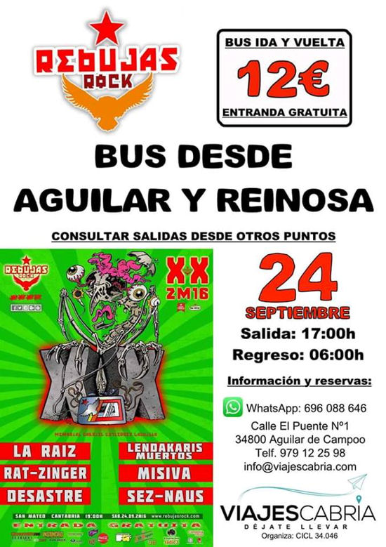 Hay un estupendo bus que os llevará el 24 de septiembre al Rebujas Rock desde Aguilar y desde Reinosa. ¡¡Reserva tu asiento, vive el Rebujas, qué no te lo cuenten!!.