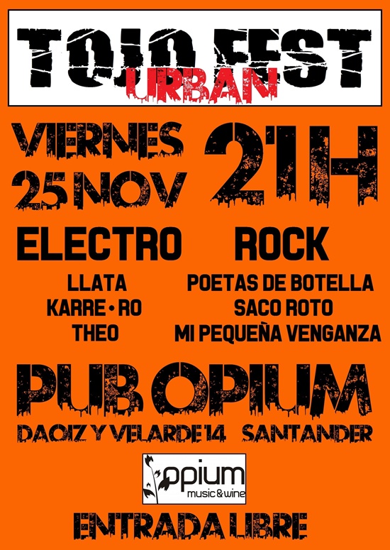 Este próximo viernes 25 de noviembre se celebrará una nueva edición del Tojo Fest. Esta vez se realizará en la ciudad de Santander, en el Pub Opium (Calle DaoÃz y Velarde 14 - zona de CañadÃo). Se mantiene la idea original de unir conciertos de Rock con sesiones de electrónica a cargo de los mejores DJ's de la ciudad. El cartel de esta edición lo componen los grupos Poetas de Botella, Saco Roto y Mi pequeña venganza, junto a los DJ's Karre, Llata, Ro y Theo. Desde las 21:00 y con entrada gratuita.