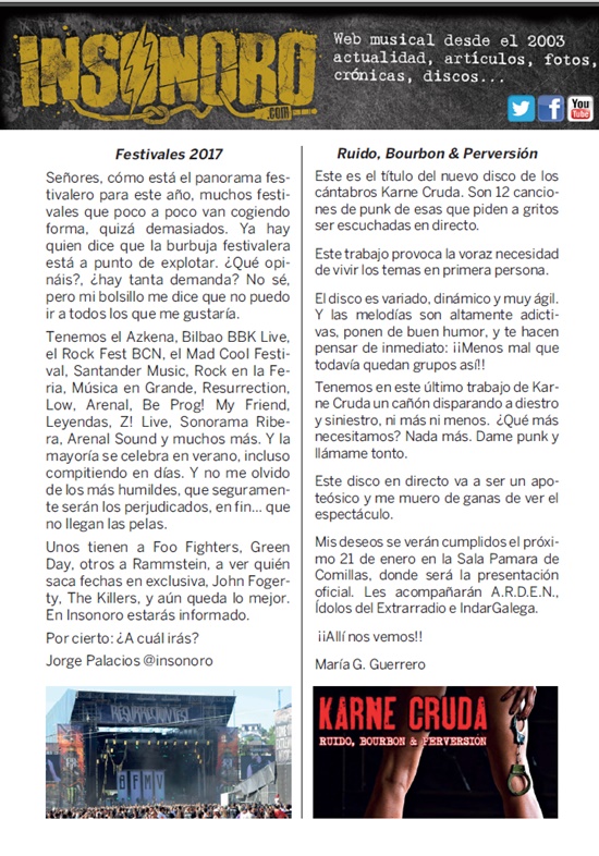 En el número de este mes de la GuÃa Go! Cantabria hablamos de los festivales para el 2017, de la gran oferta que hay y de los grupos en exclusiva que veremos a lo largo del año por nuestro paÃs, y en la faceta local, aprovechando que Karne Cruda presentará disco el 21 en Comillas, les hemos dedicado una columna en la que hablamos de su último disco "Ruido, Bourbon & Perversión". La GuÃa Go! está disponible en pdf aquà mismo.