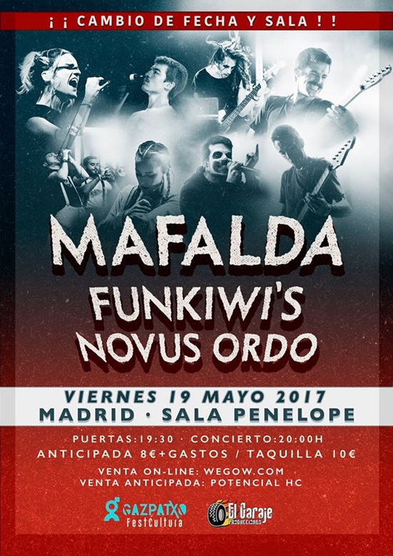 Estando a punto de colgar el cartel de entradas agotadas, el concierto de Mafalda, Funkiwis y Novus Ordo que se iba a celebrar el sábado 25 de marzo en la Sala Lemon de Madrid, se aplaza al viernes 19 de mayo en la Sala Penélope, con los mismo grupos. El motivo es que la Sala Lemon ha dejado de programar conciertos de la noche a la mañana. Nuestros amigos de Mafalda nos lo explican todo en el siguiente comunicado: