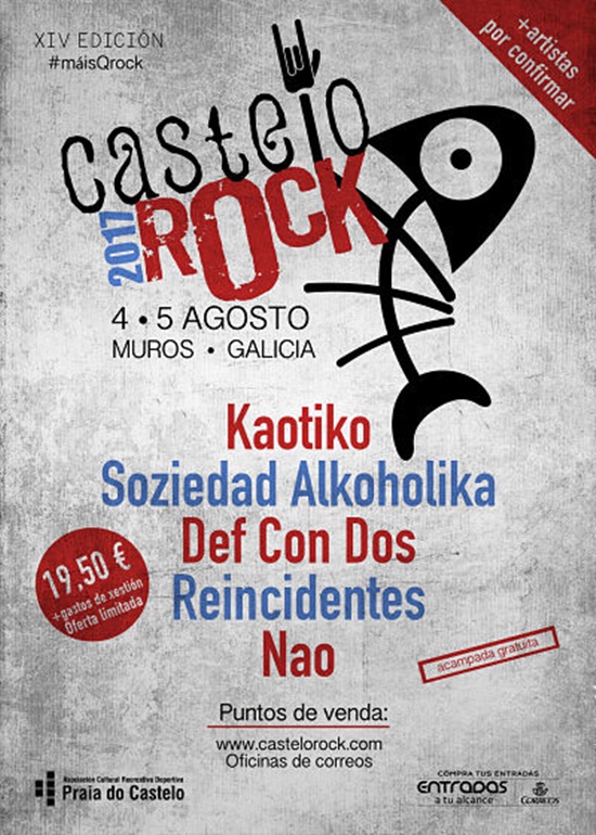 Def Con Dos, Soziedad Alkoholika, Kaótiko, Nao y Reincidentes primer adelanto del Castelo Rock 2017, 4 y 5 de agosto en Muros (A Coruña). Los bonos de dos dÃas podrán adquirirse en oferta de lanzamiento por 19,50€ en los diferentes puntos de venta (www.castelorock.com y Oficinas de Correos).