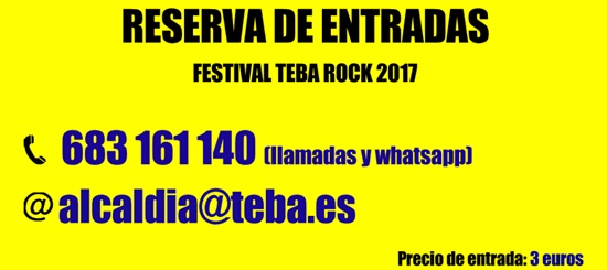 Vamos actualizando la información del TebaRock 2017, 10 de junio en Teba, Murcia. Por una lado, comentamos que tenéis a vuestra disposición un número de teléfono y una dirección de e-mail para reservar entradas del festival. Tenéis que dar vuestro nombre y el número de entradas que queréis reservar y en esos contactos os confirmarán la reserva y os dirán cómo recogerlas el día del evento. Y, por otro lado, os mostramos los horarios de actuación de cada grupo. Recordad: 10 de junio en Teba (Málaga).