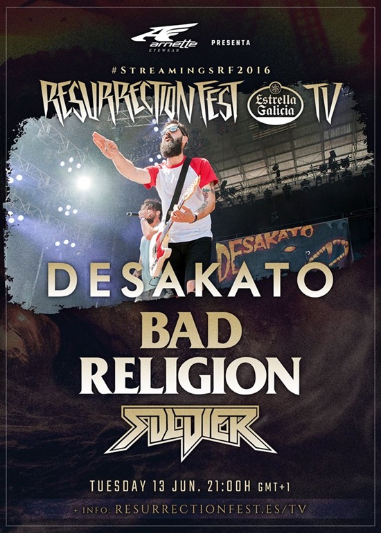 Mañana a partir de las 21:00 se emitirán los conciertos que dieron Desakato, Bad Religion y Soldier en la pasada edición del Resurrection Fest. Los podréis ver aquÃ: www.resurrectionfest.es/tv