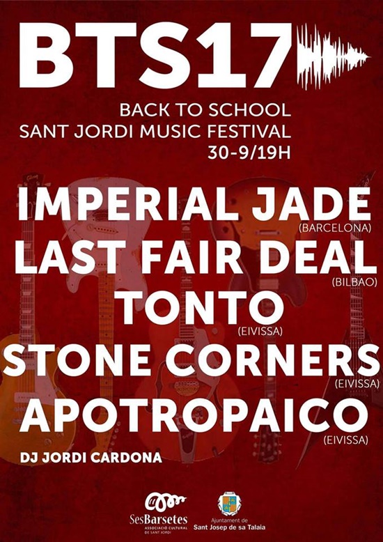 Os mostramos el cartel del Back to School, Sant Jordi Music Festival de Ibiza. El 30 de septiembre se podrá disfrutar de los directos de Imperial Jade, Last Fair Deal, Tonto, Stone Corners, Apotropaico y DJ Jordi Cardona. ¡No te lo puedes perder!