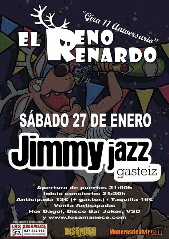 El próximo sábado 27 de enero El Reno Renardo visitará Vitoria-Gasteiz y la Sala Jimmy Jazz nos cede dos entradas para sortear entre todos nuestros usuarios. El concierto, que formará parte de su "Gira 11 Aniversario" dará comienzo a las 21:30h. y las entradas, 13€ anticipadas y 16€ en taquilla, ya están a la venta en Disco Bar Joker, VSD y Losamanece.com. Sorteamos dos entradas individuales, si habÃas participado, vuelve a hacerlo ya que hemos perdido los datos de la gente que ha participado la semana pasada.