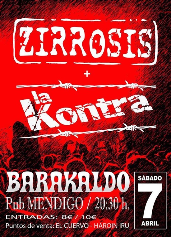 La banda de Aranda de Duero, Zirrosis, visitarán Barakaldo el próximo 7 de abril y compartirán escenario con La Kontra en el Pub Mendigo. Entradas a 8 euros y 10 en taquilla, hacÃa mucho tiempo que no sabÃamos nada de esta gente.