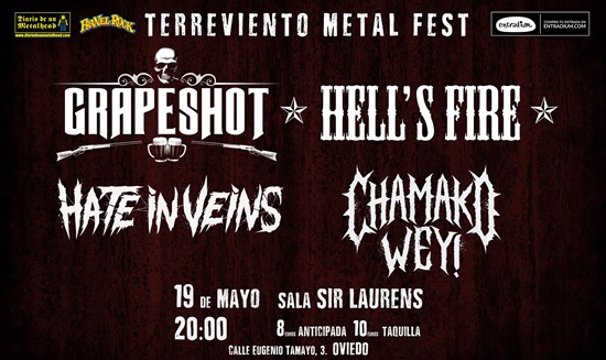 AnÃmense que el sábado, 19 de mayo, se montará una buena en la Sala Sir Laurens de Oviedo en el Terreviento Metal Fest, cuatro grupos como la copia de un pino, Grapeshot, Hate in Veins, Hell´s Fire y Chamako Wey!. 8€ anticipada y 10€ en taquilla: