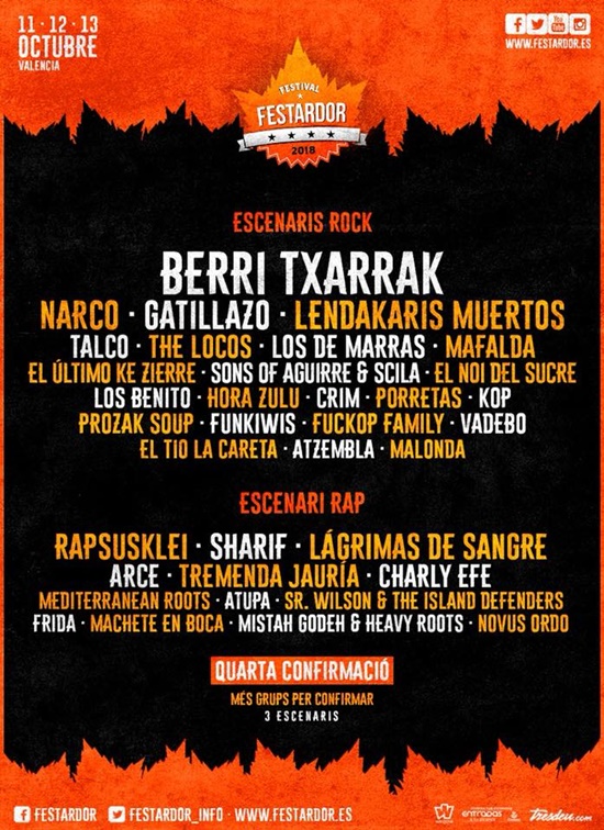Así queda el cartel del Festardor con la última incorporación de Mafalda, 11, 12 y 13 de octubre, también está Berri Txarrak, Lendakaris, Gatillazo, Narco, Lágrimas de Sangre...