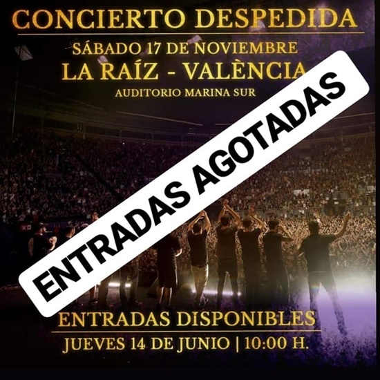 La Raiz agota entradas para la despedida definitiva del 17 de noviembre en Valencia, en el Auditorio Marina Sur. Más de 18000 almas se darán cita para despedir a una banda que empezó desde cero, y con tesón, promoción y buena música han rozado el cielo.