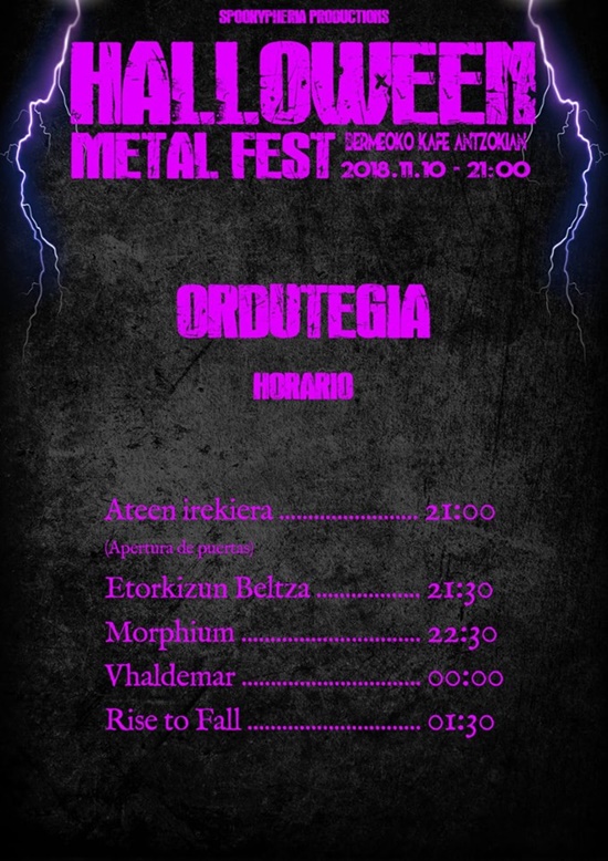 El sábado 10 de noviembre, se celebrará la XI edición del Halloween Metal Fest en el Kafe Antzokia de Bermeo (Bizkaia) con Etorkizun Beltza, MorphiuM, Vhäldemar y Rise To Fall. Y además de todo esto la habitual Halloween Metal Videojukebox, música metal hasta las 06.00 y sorteos y muchas sorpresas en una noche que no podrás olvidar. Entradas anticipadas por solo 11 €