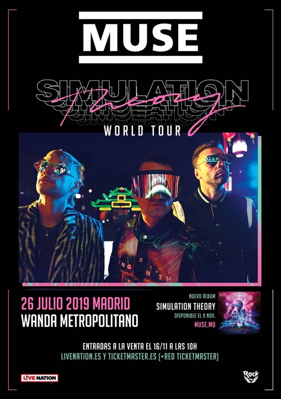 Tras su paso por Bilbao, Muse confirma nueva fecha en España dentro de su Simulation Theory World Tour, será en el Wanda Metropolitano de Madrid el 26 de julio, única fecha para el 2019 por el paÃs. Las entradas saldrán a la venta el 16 de noviembre a las 10h en www.livenation.es y www.ticketmaster.es (+red Ticketmaster).