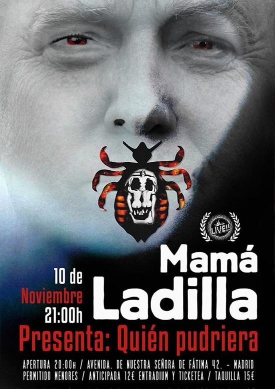 La gira presentación de "Quién Pudriera" de Mamá Ladilla pasará por Madrid este sábado 10 de noviembre, será en la Sala Live! a eso de las 20:00 h puertas y 21:00 h concierto (puntual) 12€ anticipada, 15€ en taquillla. Entradas en entradium.com o ticketea.com