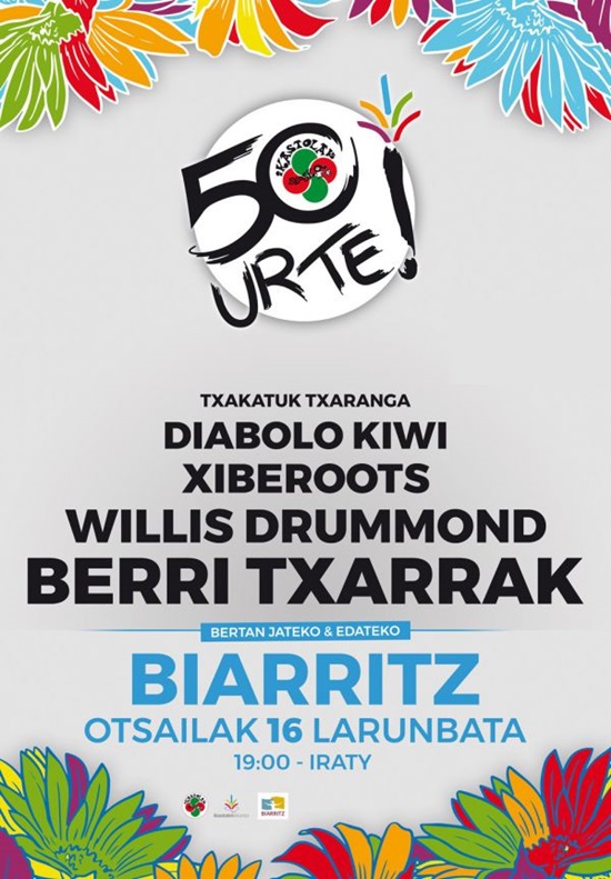 Cartel de la fiesta aniversario por los 50 años de la ikastola Seaska de Biarritz. Sábado 16 de febrero con Berri Txarrak, Willis Drummond... Entradas a a la venta en este enlace.