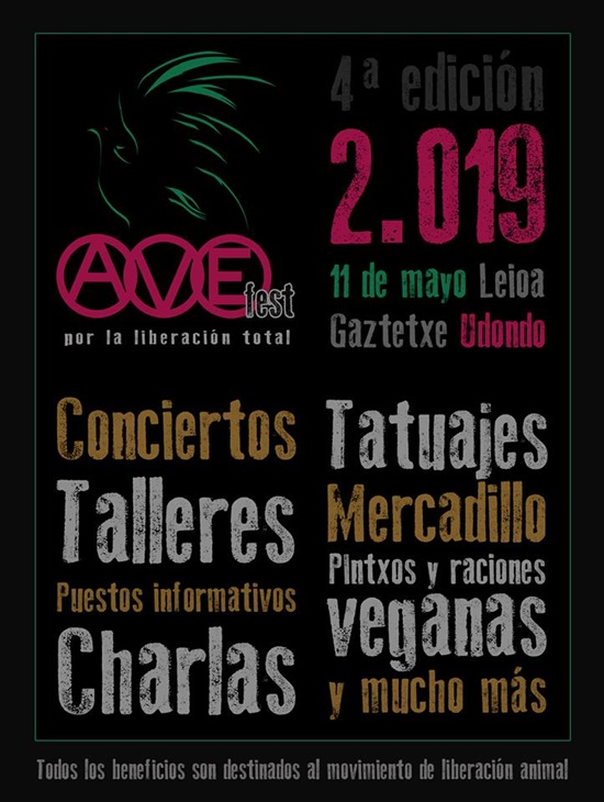 El Ave Fest, por la liberación total, ya tiene fecha para su cuarta edición, 11 de mayo en el Gaztetxe de Udondo en Leioa, con conciertos, talleres, mercadillo, charlas... será una jornada completÃsima.