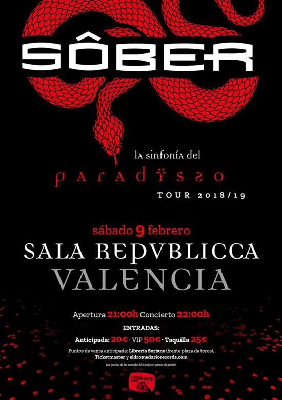 La gira "Sinfonía del Paradysso" de Sôber recalará en la Sala Repvblicca de Valencia el sábado 9 de febrero, a las 21:00 apertura de puertas, concierto a las 22:00 h. Entrada a 20 euros anticipadas, 50 euros VIP y 25 euros en taquilla. Puntos de venta, Librería Soriano, Ticketmaster y eldromedariorecords.com.