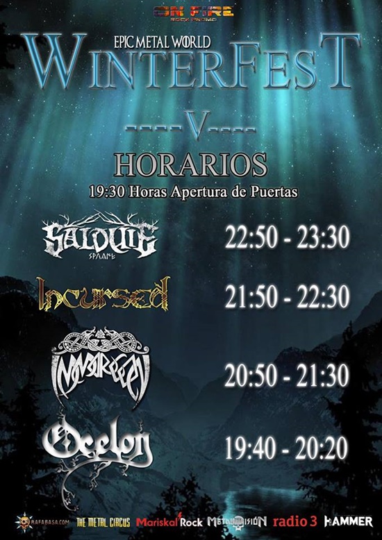 La quinta edición del Winterfest de Barcelona que se celebra el viernes 8 de febrero, anuncia sus horarios, por allí veremos a Incursed, Immorgon, Salduie y Ocelon. Entradas a 10 euros anticipada (Pentagram y Entradium) y de 15€ en taquilla. En la Sala Bóveda.