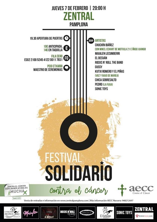Mañana jueves la Zentral de Pamplona acogerá un evento solidario contra el Cáncer, a partir de las 19:30 h, conciertos a las 20:00 h, con las actuaciones de El Desván, Gussy, Kutxi Romero y El Piñas, Pedro de La Fuga, Sonic Toys... Entradas: Anticipadas: 10€ + gastos - Taquilla: 14€. Fila cero: ES62 2100 5245 4122 0011 7831. La AEEC destinará lo recaudado a continuar con las actividades de apoyo y acompañamiento a pacientes oncológicos y sus familiares en Navarra.