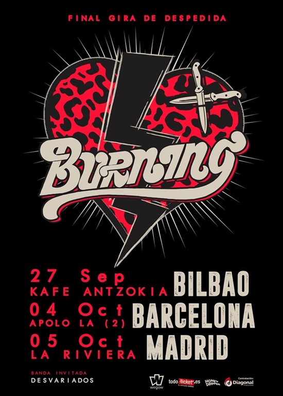 Ya a la venta las entradas para las tres últimas fechas de la gira de despedida de Burning, disponibles en Wegow. La gira despedida llega a su fin, 27 de septiembre Kafe Antzokia en Bilbao, 4 de octubre Sala Apolo Barcelona, 5 de octubre La Riviera, Madrid. La banda invitada será Desvariados.