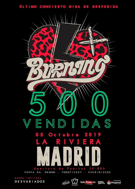 La venta de entradas para la fecha de Madrid de Burning, dentro de su gira de despedida, va a buen ritmo, en apenas 5 dÃas se han vendido más de 500 entradas. Avisados estáis. En Escridiscos y en Wegow también.