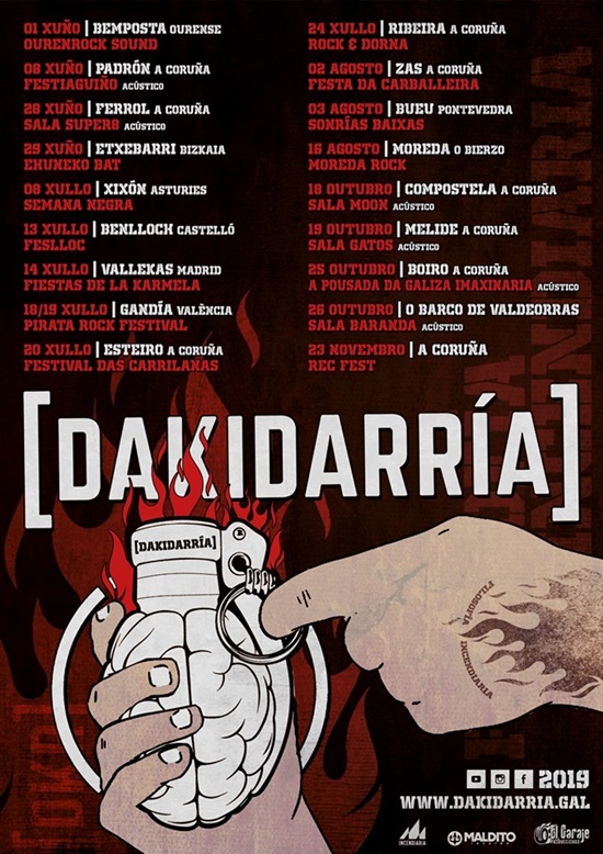 Dispuestos a hacer explotar cualquier escenario, los gallegos Dakidarria nos muestran sus próximos conciertos, la mayorÃa por Galicia, pero harán excursiones a Madrid, Castellón y Valencia los próximos meses.