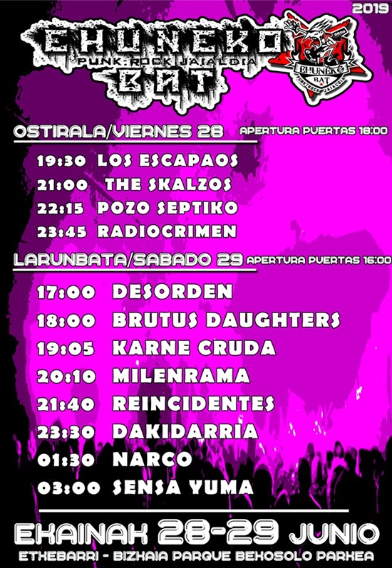 Estos son los horarios oficiales del Ehuneko Bat 2019, la próxima semana en Etxebarri, Bizkaia con grupazos como Narco, Dakidarria, Reincidentes, Karne Cruda...