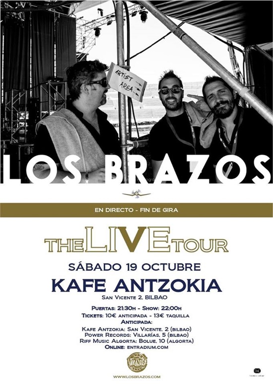 Los Brazos pondrán fin a su gira "The Live Tour", el 19 de octubre en el Kafe Antzokia de Bilbao, apertura de puertas a las 21:30 h, el show dará comienzo a las 20:00 h. Entradas a 10 euros anticipada y 13 euros en taquilla.