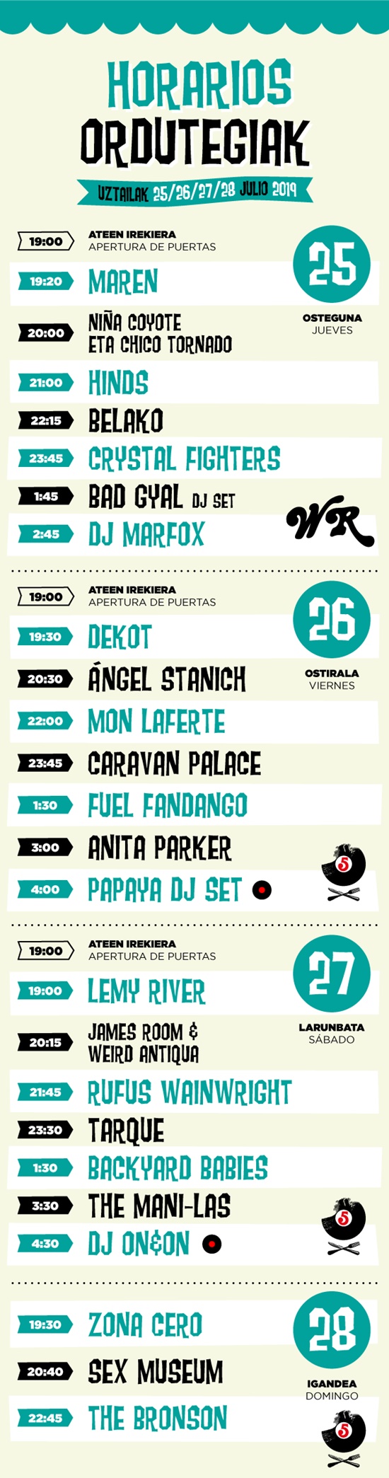 Ya disponibles los horarios del Bay of Biscay Festival en su quinta edición, antes conocido como el Mundaka Festival y que este año ha cambiado de denominación. 26, 27 y 28 de julio, con Rufus Wainwright, Caravan Palace, Fuel Fandango, Mon Laferte, Tarque, Ángel Stanich, The Mani-Las, Anita Parker, James Room, Dekot y Zona Cero entre otros tantos que podéis ver a continuación: