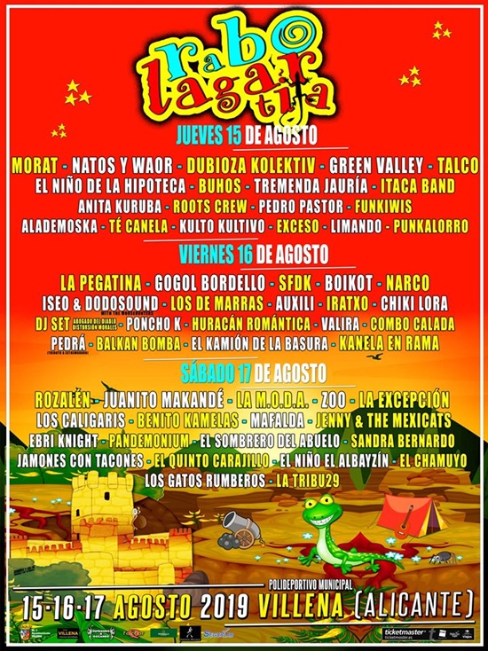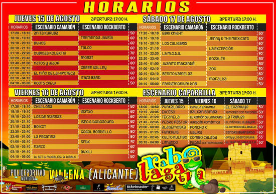 Se acerca peligrosamente uno de los festivales más bailongos de la penÃnsula, el Rabolagartija de Villena, Alicante, del 15 al 17 de agosto siendo estos los horarios oficiales.