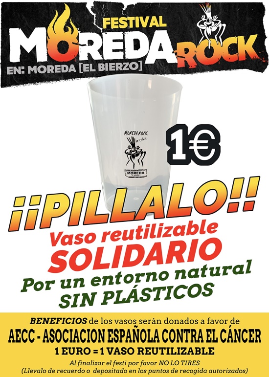 El Festival Moreda Rock, que este año contará con Mala Reputación, Interés Variable y Dakidarria el 16 de agosto en Moreda (El Bierzo), se suman a la iniciativa del vaso reutilizable, pero van más allá, será solidario, es decir, los beneficios de su compra irán destinados a la AECC - Asociación Española Contra El Cancer. La adquisición del vaso será opcional, si los quieres desechables de toda la vida también los tendrás.
