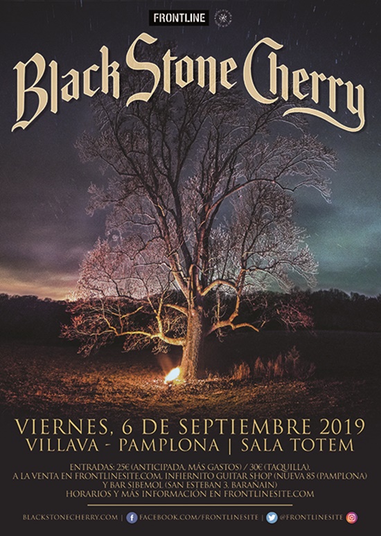 Horarios para el concierto completo Black Stone Cherry en Villava / Pamplona el viernes en la Sala Totem. Venta de entradas anticipadas en: El Infiernito (Nueva 85, 31001 Pamplona), SiBemol (San Esteban 3, 31010 Barañain, Navarra), Krawill (Carmen 9, 31001 Pamplona) y www.frontlinesite.com