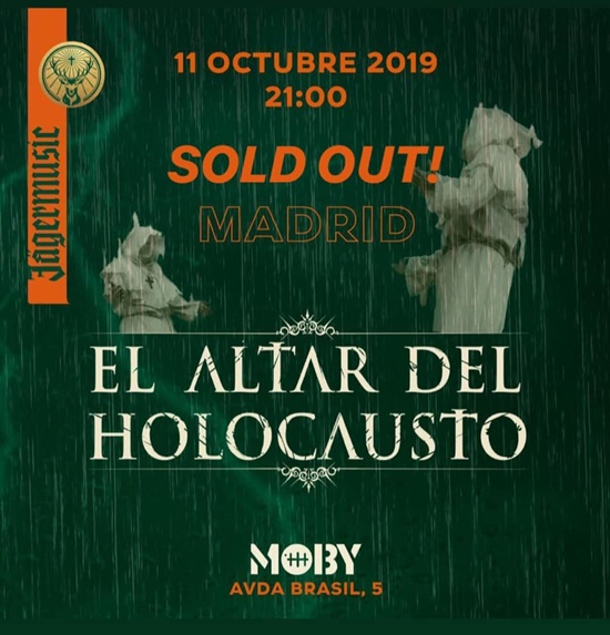 El Altar del Holocausto cuelga el cartel de entradas agotadas para su concierto de mañana viernes 11 de octubre en la Sala Moby Dick de Madrid. Avisan de que no habrá entradas en taquilla. A las 21:00 h todos allà para darlo todo, valga la redundancia.