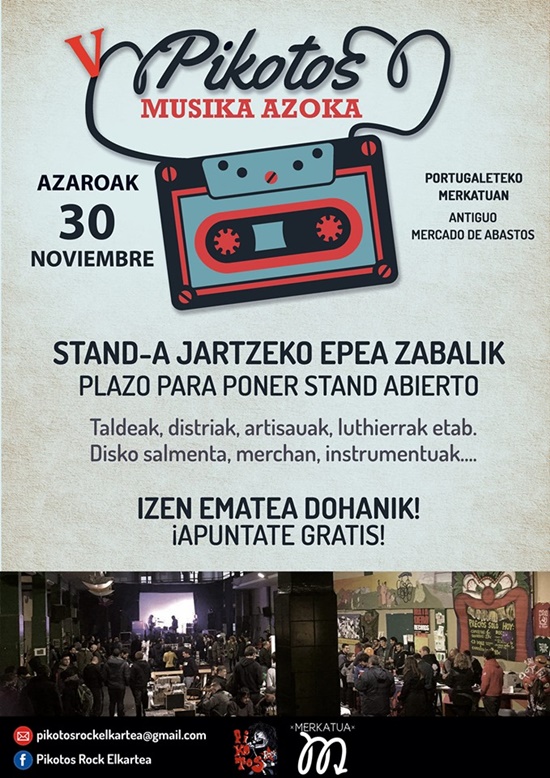 El Pikotos Musika Azoka avisa que estamos a un mes de la próxima edición, si quieres montar un stand aún estás a tiempo. 30 de noviembre en el Antiguo Mercado de Abastos de Portugalete. Ponte en contacto con esta buena gente al mail pikotosrockelkartea@gmail.com