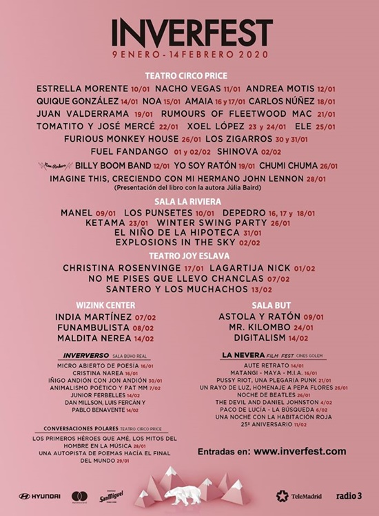 El Inverfest 2020 llega al ecuador de su programa, un ciclo multicultural que durará hasta el 14 de febrero, con conciertos, cine, poesÃa, conferencias. Estas son las próximas citas musicales: