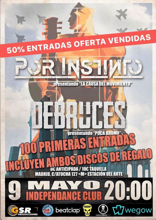 Por Instinto y Debruces presentarán juntos y revueltos sus nuevos discos: "La Causa del Movimiento" y "Poca Broma" respectivamente, lo harán en la sala Independance Club (c/ Atocha, 127 Estación del arte) el 9 de mayo. Entradas en oferta a 8 euros aquÃ, además incluyen los dos discos de regalo (se darán en la entrada del concierto)