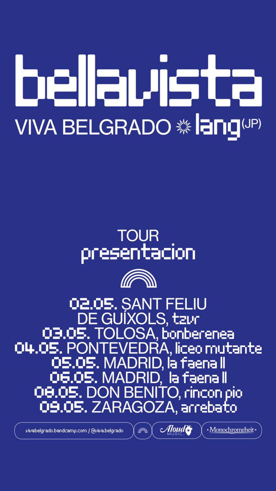 Del 2 al 9 de mayo el cuarteto cordobés Viva Belgrado se sube a la furgoneta para la primera gira de su nueva etapa, con "Bellavista" a punto de salir a la luz. De hecho, el disco saldrá solamente tres días antes del primer concierto de esta gira, el 30 de abril.